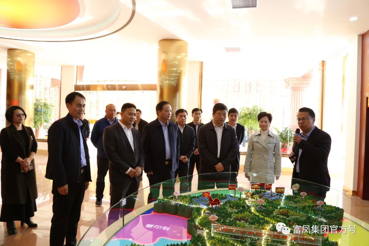 ▲参观富鹏鸡产业核心示范区沙盘,了解富鹏鸡产业带动全市十二个乡镇农户实现产业脱贫情况。